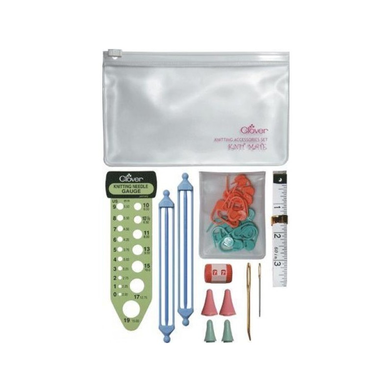 917 321 358**Clover - Conjunto de acessórios para tricot, com estojo. Inclui: marcas para tricot, protectores para a ponta das agulhas (evitam que as malhas se percam quando o trabalho está em repouso), contador de carreiras, alfinetes para segurar malhas, medidor de espessura de agulhas e fita métrica.