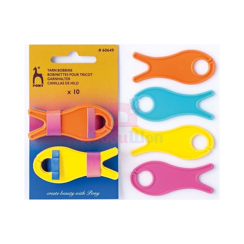 Estas bobinas permitem enrolar uma quantidade adequada de fio e mantê-lo preso à peça tricotada no lugar certo.