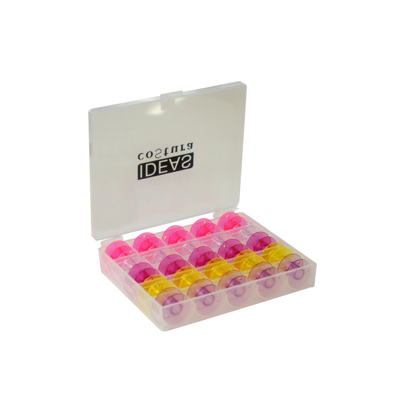 Caixa em plástico com 25 bobinas/canelas incluídas.