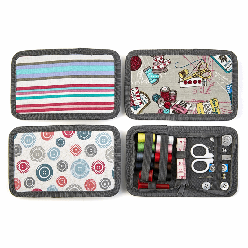 917 321 358**Estojo prático 100% algodão colorido com fecho, contendo itens essenciais para costura e conserto