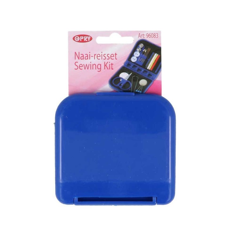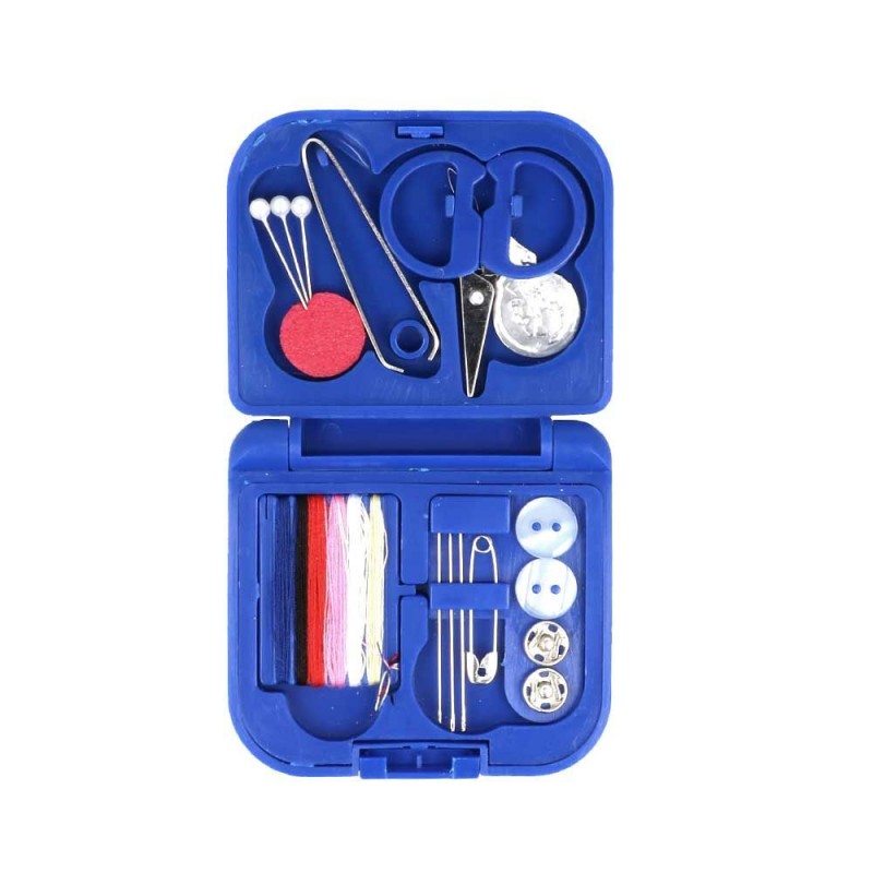 Cada conjunto contém: uma tesoura, pinça, um enfiador de linha, um conjunto de agulhas de costura, alfinetes, botões de pressão, um alfinete de segurança e algumas linhas de costura padrão em cores usadas com frequência. Fornecido num estojo azul compacto.