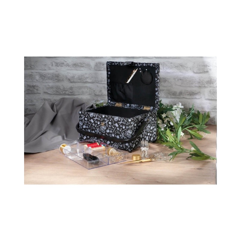 Possui uma alça externa para poder transportar confortavelmente o kit de costura para qualquer lugar que você precisar. Na sua base encontrará pés de plástico para apoiar a caixa de costura. Como fecho, oferece um botão magnético que fixa o conteúdo interior.