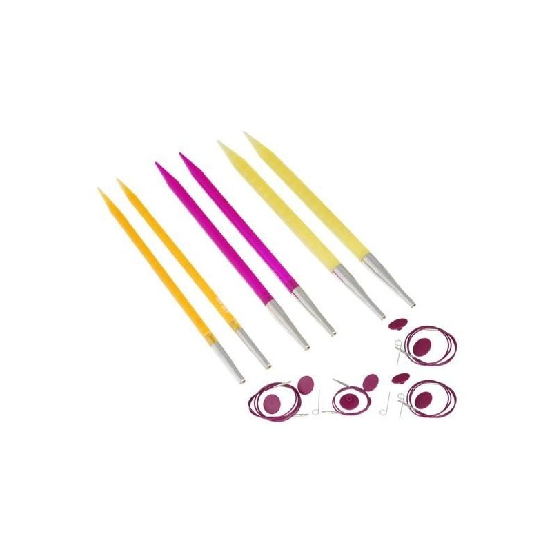 917 321 358**KnitPro Spectra Trendz Acryl Chunky - Kit de agulhas circulares para tricot intercambiáveis em acrílico transparente da marca KnitPro. Inclui 3 cabos (60, 80 e 100cm), três pares de agulhas (4mm; 5mm e 6mm) e 6 bloqueadores para deixar as malhas em descanso nos cabos sem que elas se soltem e 3 chaves.