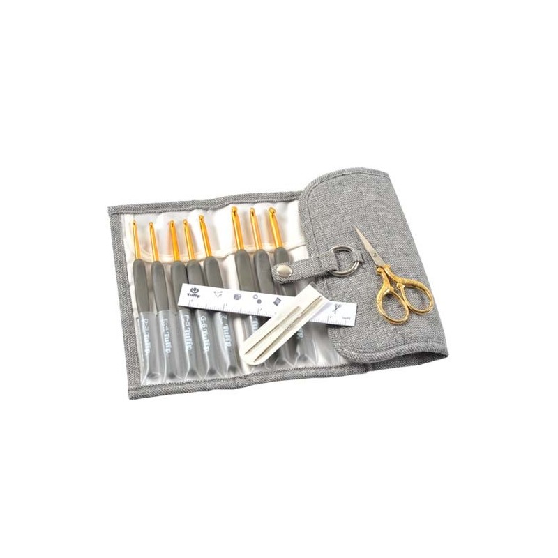 O estojo de crochet Tulip Etimo Royal, Gold contém 8 agulhas de tamanhos 2 mm, 2,2 mm, 2,5 mm, 3 mm, 3,5 mm, 4 mm, 5 mm e 6 mm , uma tesoura italiana de grande qualidade, duas agulhas de tapeçaria e uma régua.