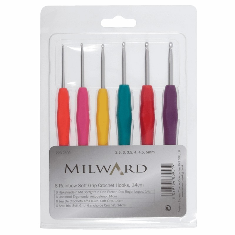 917 321 358**O conjunto de agulhas de crochet Rainbow Soft Grip da Milward apresenta uma coleção de 6 agulhas de crochet em diferentes tamanhos: 2,5 – 3 – 3,5 – 4 – 4,5 – 5 mm. As agulhas de crochet são feitas de alumínio e incluem uma alça ergonômica em cores alegres.