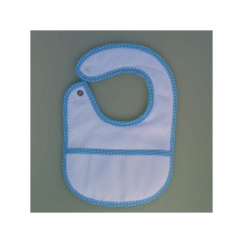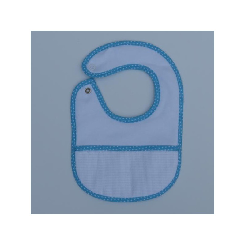 917 321 358**Babete de bebé com bolsa em quadrilé para bordar. Parte de trás do babete revestido a PVC.