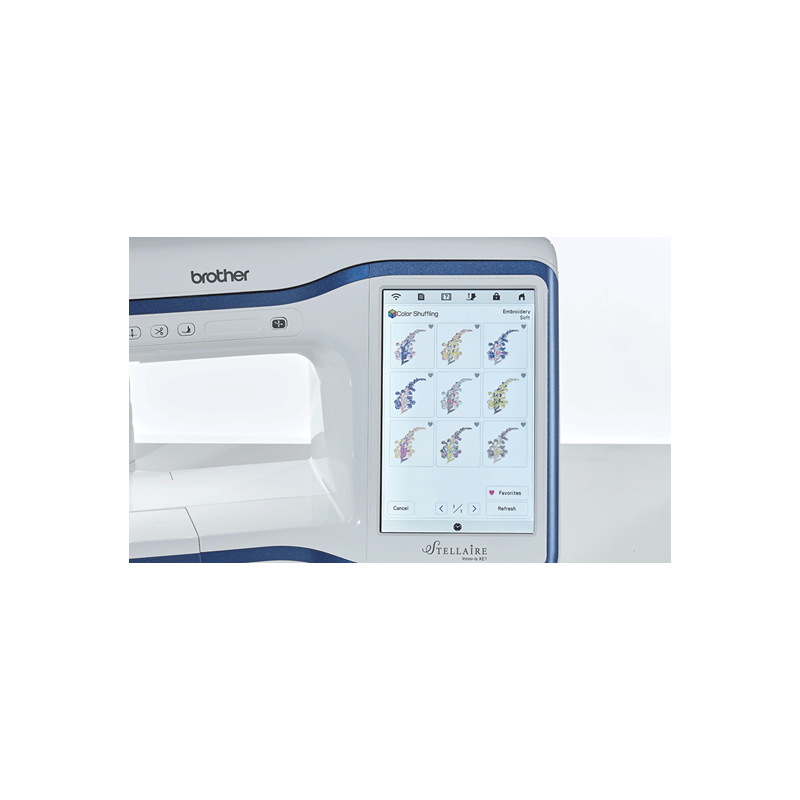A máquina de bordar Stellaire Innov-is XE1 TEM um apontador de agulha descendente de LED para um posicionamento perfeito de precisão do laser e velocidades de bordado mais rápidas de até 1.050 ppm. Há uma tela LCD HD de 10,1" brilhante e iluminação LED aprimorada com cinco configurações, incluindo desligado.