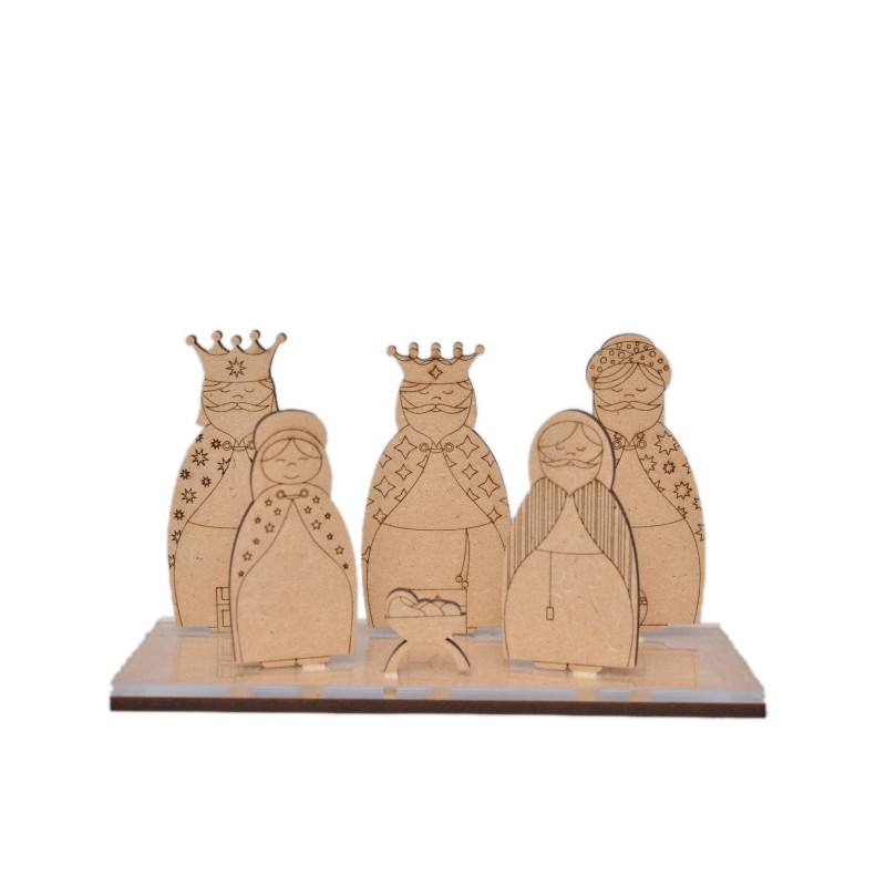 Presépio em MDF de 6 peças com 7cm e com base dupla de acrílico de 13.5x5.5x0.3cm.
