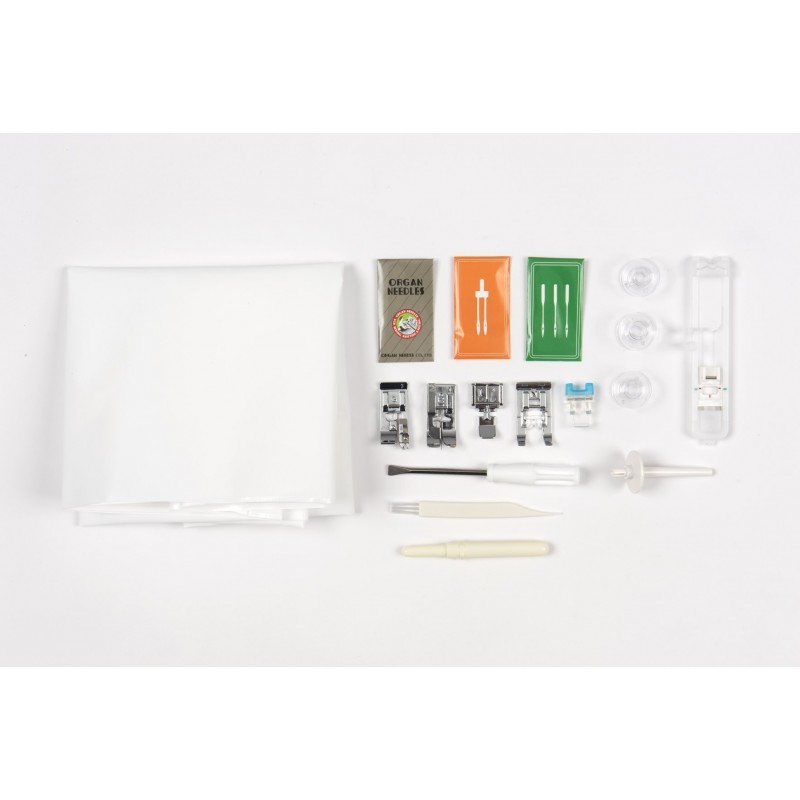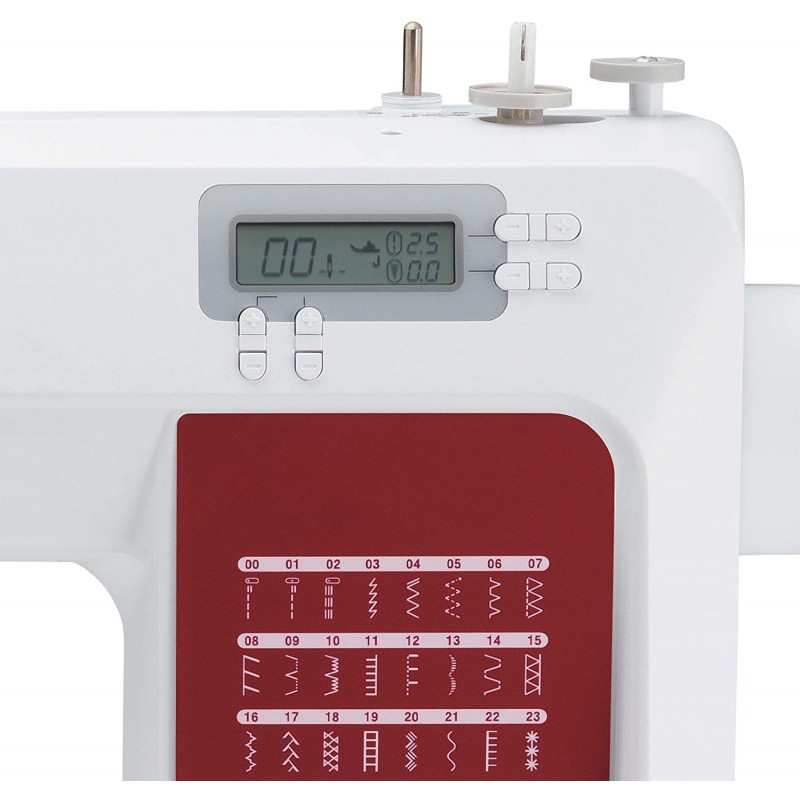 Funções fáceis de usar, tais como o sistema automático de enfiar a linha na agulha, a bobina de rápida instalação, o controle eletrônico do calcador, e um lindo e dinâmico painel em LCD.