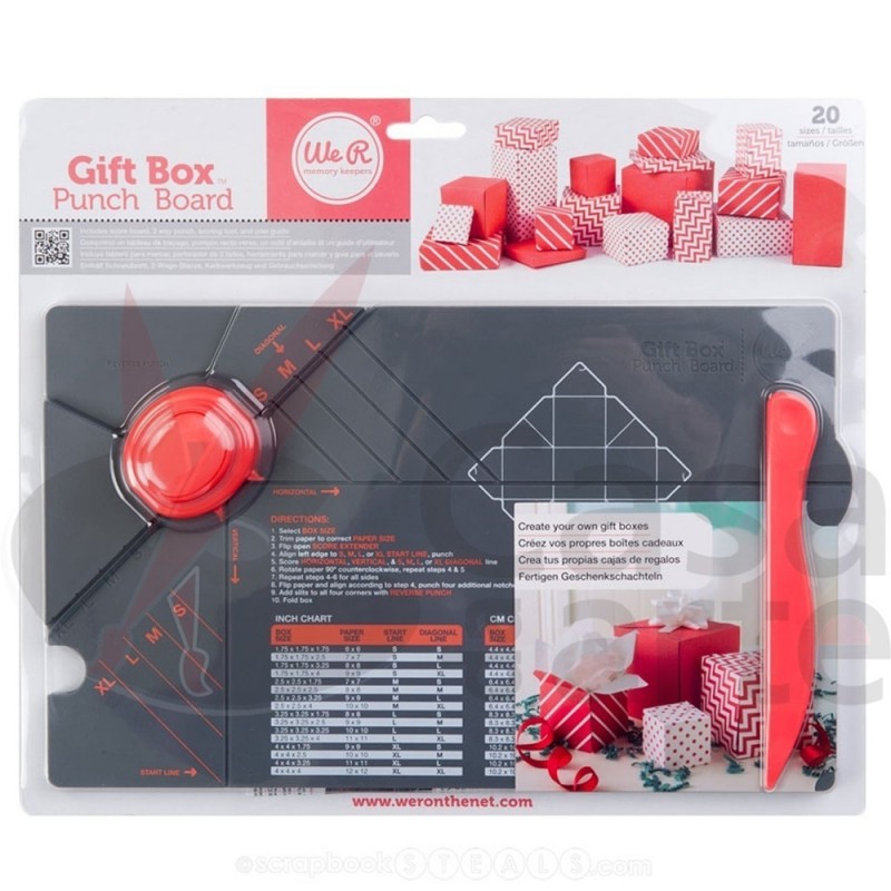 917 321 358**We R Memory Keepers - Gift Box Punch Boarder - Placa de dobragem de caixas quadradas e cúbicas para papeis e cartolinas. Fácil de usar, permite fazer os mais diversos tamanhos de caixas. Inclui tabela de medidas, furador de 2 lados e acessório para vincar (dobradeira).