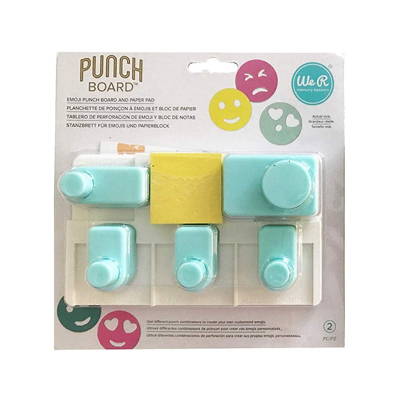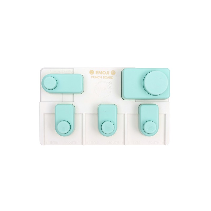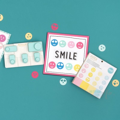Esta nova Punch é composta de 5 furadores: uma circular para o exterior , um sorriso que pode ser usado em ambas as direções, e um coração, um ponto e um olho piscando que pode ser usado tanto para os olhos quanto para a boca.