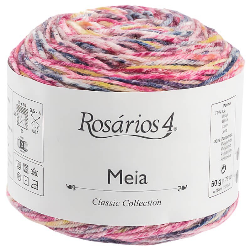 Meia Print é um fio colorido, feito de lã merino e poliamida. Essa composição proporciona total conforto, pois enquanto a lã merino oferece maciez e doçura ao toque, a poliamida dá um ponto extra de flexibilidade para que seus projetos se adaptem a cada movimento. Isso o torna especial para meias de tricot.