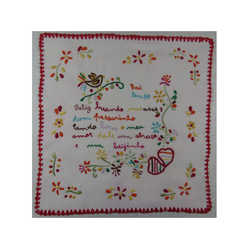 Cada lenço é uma peça única, que retrata sentimentos amorosos. As frases são escritas com erros ortográficos devido à idade e escolaridade das primeiras bordadeiras, era a fonética que importava. É um quadrado não perfeito.