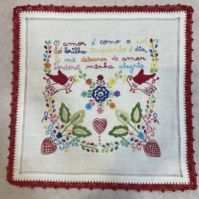 Cada lenço é uma peça única, que retrata sentimentos amorosos. As frases são escritas com erros ortográficos devido à idade e escolaridade das primeiras bordadeiras, era a fonética que importava. É um quadrado não perfeito.