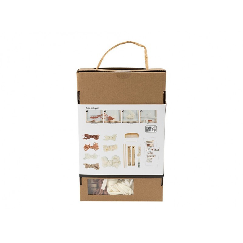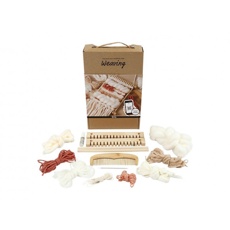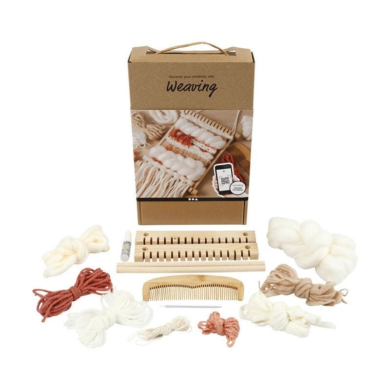 917 321 358**Contém: tear, cola, 6m de fio de urdidura, pente, agulha de costura e fio de várias cores e qualidades - 30m no total.