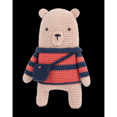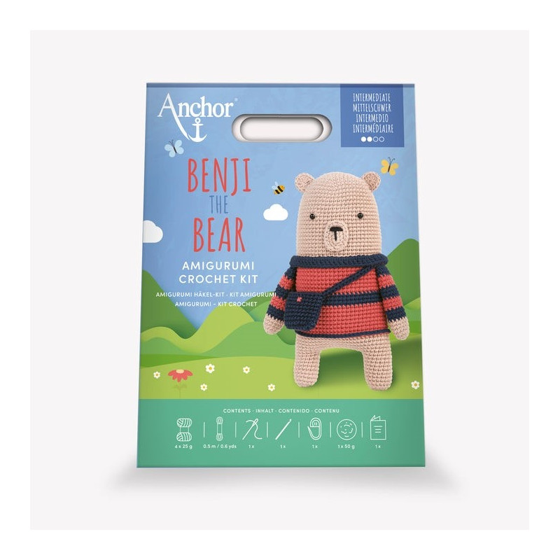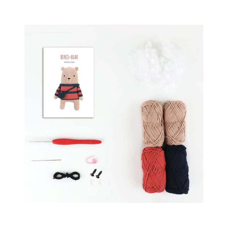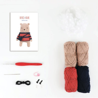 Os crocheteiros de nível intermédio vão adorar dar vida a este grande desenho do urso Benji. O kit contém tudo que você precisa para fazer seu amigurumi, incluindo fio 100% Algodão , linha, agulha de crochet, acessórios, enchimento e instruções.