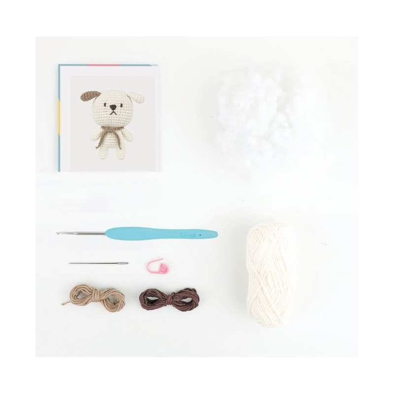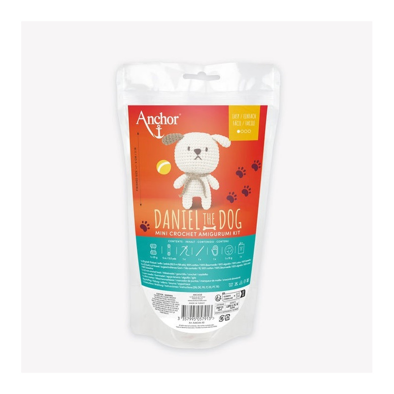 Os crocheteiros principiantes vão adorar dar vida a este mini desenho do cão Daniel. O kit contém tudo o que você precisa para fazer seu amigurumi, incluindo fio 100% algodão, linha, agulha de crochet, acessórios, enchimento e instruções.