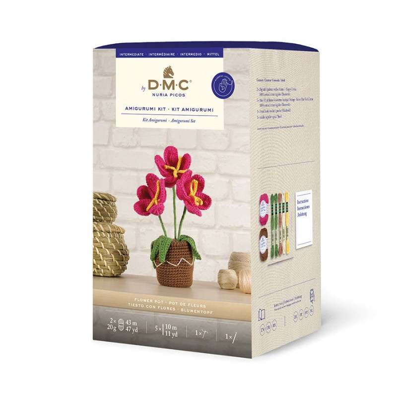 O vaso de flores em amigurumi, desenhado por Nuria Picos, dará um toque natural à decoração da sua casa sem necessidade de manutenção! O kit contém tudo o que é necessário para realizar o projeto, incluindo dois novelos de Happy Cotton, cinco meadas de Retors Mat, uma agulha de crochet de 3 mm e uma agulha para coser.