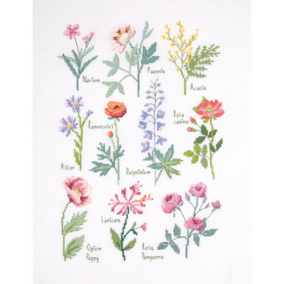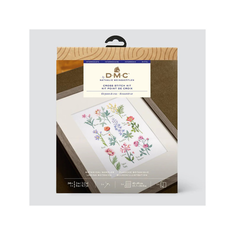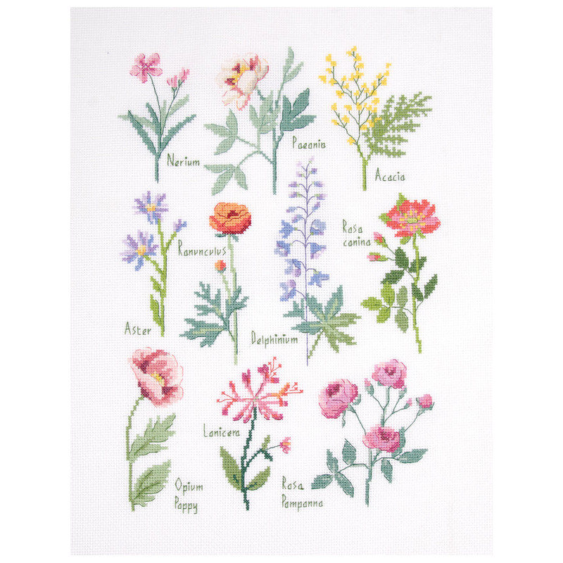 Explore o encanto da natureza com o kit de ponto cruz "Imagem Botânica" da coleção DMC Designer 3.0. Este design apresenta uma delicada ilustração bordada de flores clássicas, cada uma com seu nome botânico, evocando o estilo de pratos científicos antigos.