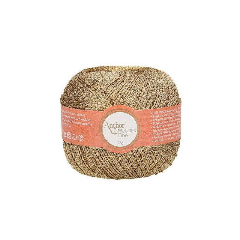 Anchor Metallic fine é um fio fino e delicado feito de uma mistura de viscose (65%) e poliéster metalizado (35%) que lhe confere um glamoroso efeito cintilante. Além de ser ideal para peças finas de luxo, também combina perfeitamente com os fios de algodão Anchor para adicionar um efeito cintilante a qualquer projeto de vestuário, acessórios ou decoração doméstica. Disponível em 2 tonalidades brilhantes: ouro e prata.