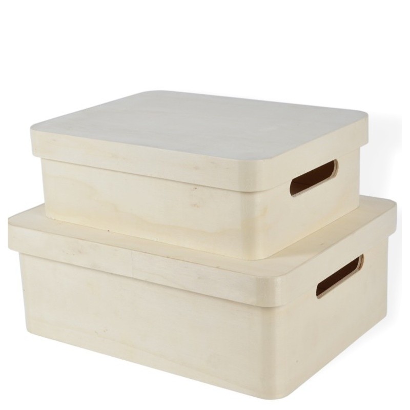 Caixa de madeira com tampa de encaixe e duas aberturas laterais para pegar. O seu design com cantos arredondados torna a peça moderna e actual.
