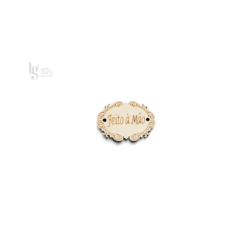 Placa "Feito à Mão" em choupo com 4x2.8x0.3cm.