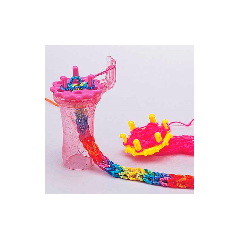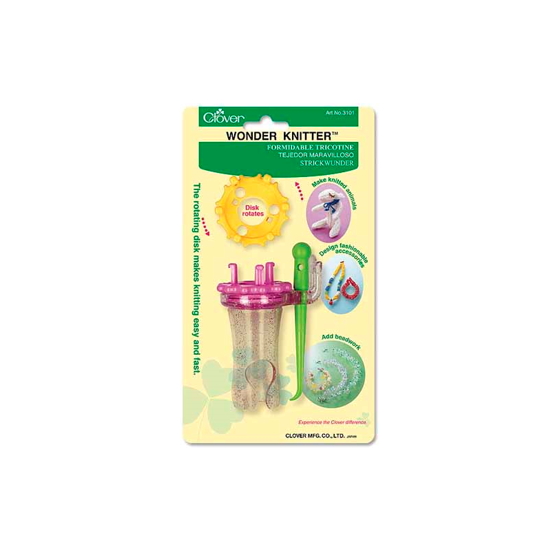 917 321 358**Clover - Wonder Knitter ™ é uma tecedora para tricot. Vem com dois discos rotativos intercambiáveis (3 e 6 pinos) para tricotar duas larguras diferentes de trança e com o acessório para manusear os fios.
