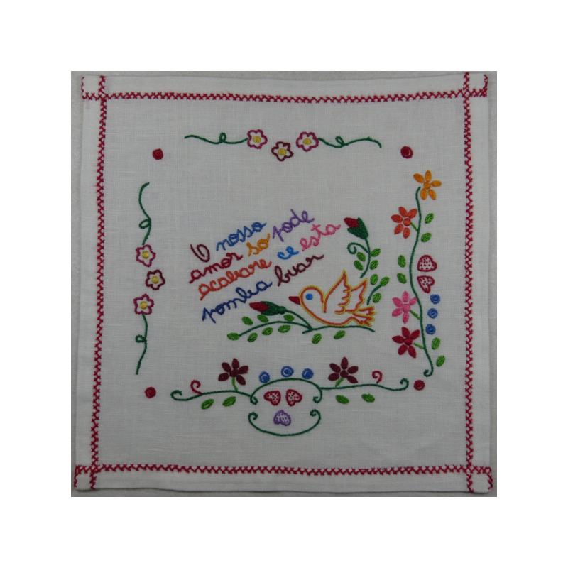 Cada lenço é uma peça única, que retrata sentimentos amorosos. As frases são escritas com erros ortográficos devido à idade e escolaridade das primeiras bordadeiras, era a fonética que importava. É um quadrado não perfeito.
