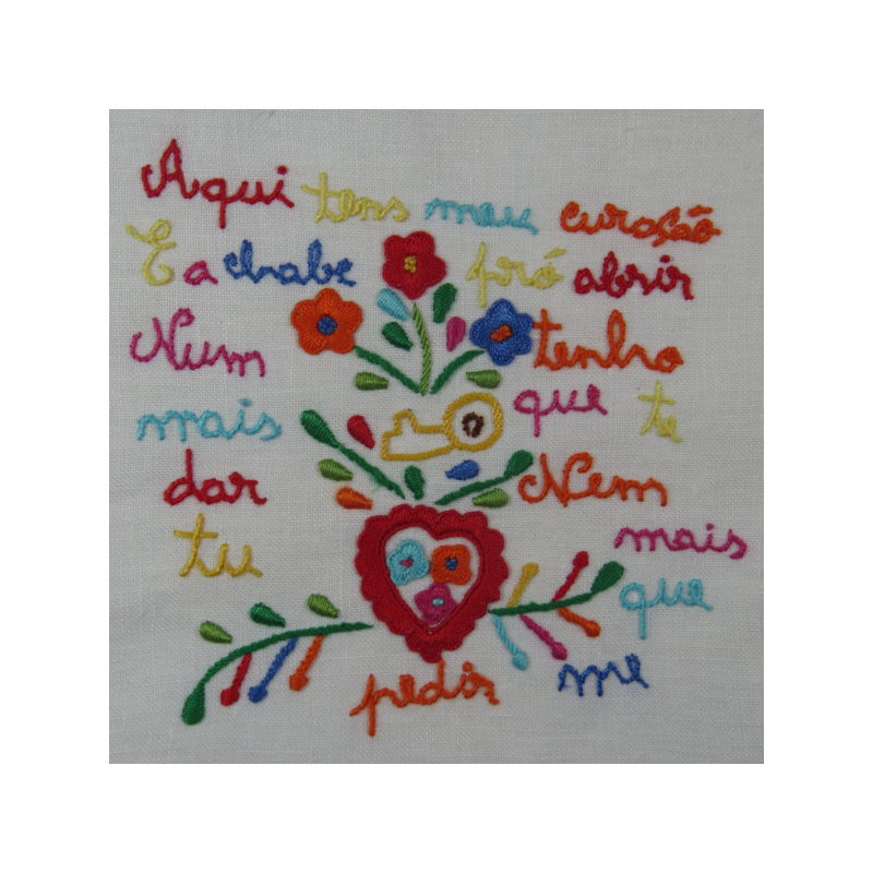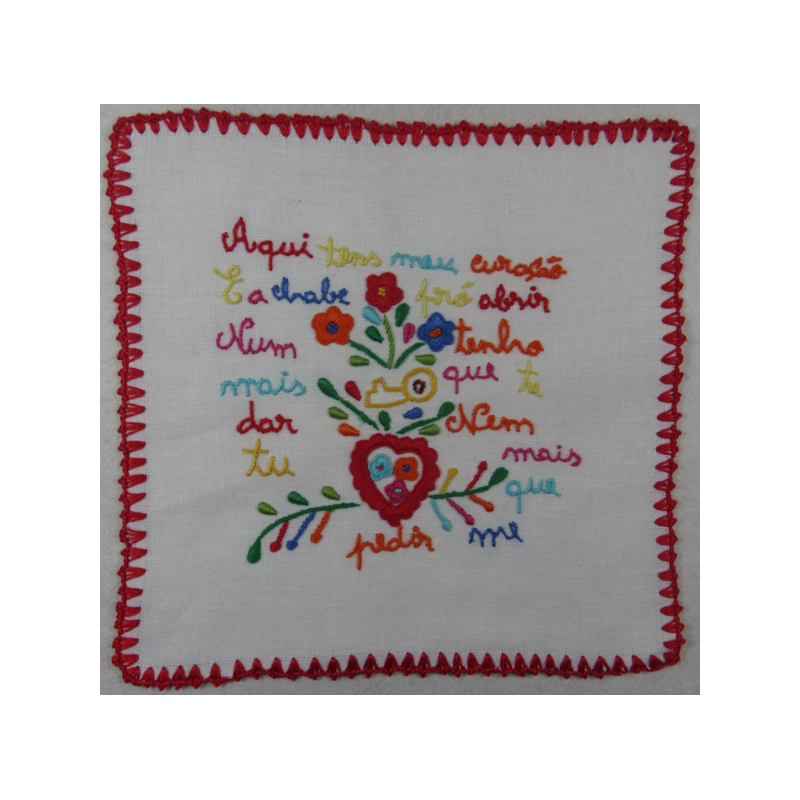 Cada lenço é uma peça única, que retrata sentimentos amorosos. As frases são escritas com erros ortográficos devido à idade e escolaridade das primeiras bordadeiras, era a fonética que importava. É um quadrado não perfeito.