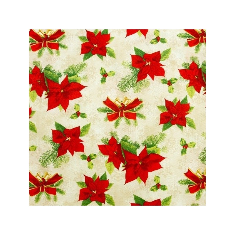 917 321 358**Tecido de Natal estampado em loneta, com ilustrações alusivas à época com azevinhos, poinsetias e laços de Natal. Recomendado para a toalha de mesa da ceia na consoada.
