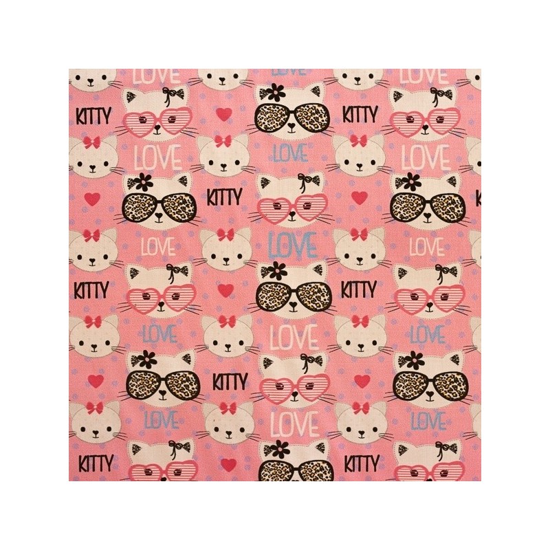 917 321 358**Tecido estampado infantil em percal de algodão, com gatos simpáticos inspirados na Hello Kitty em tons predominantemente de rosa