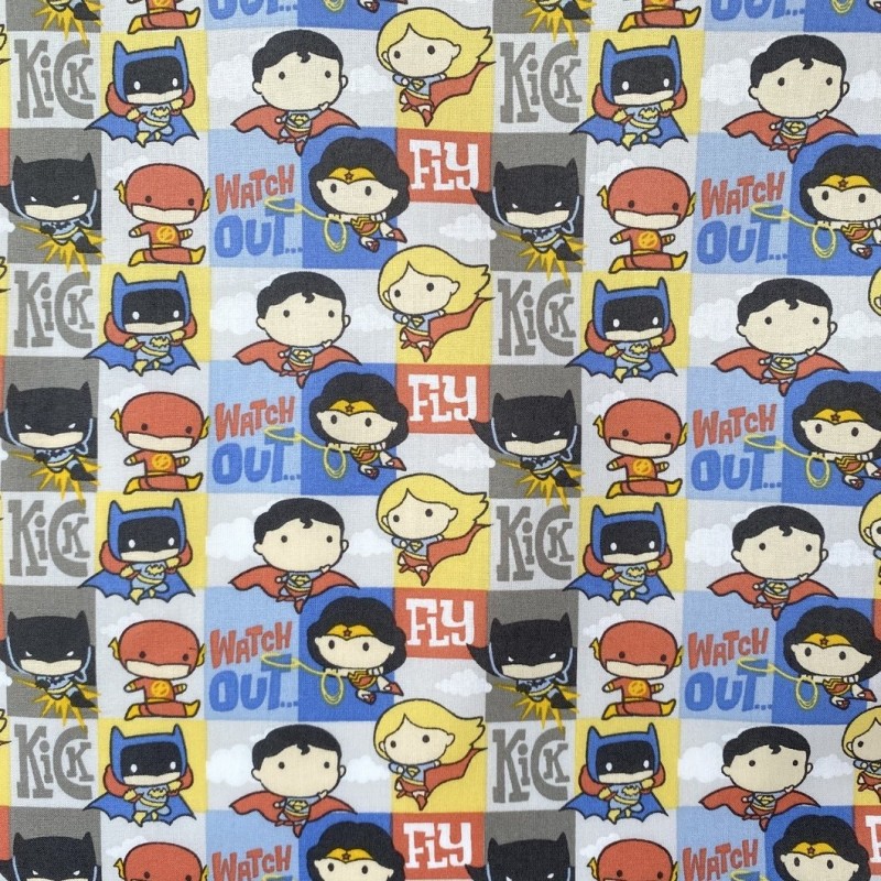917 321 358**Heróis da Liga da Justiça em Ação da The Craft Cotton Company. Super-heróis da DC Comics incluindo Batman, Superman, Wonderwoman, Superwoman e Capitão América com as palavras 'voe' 'chute' 'cuidado