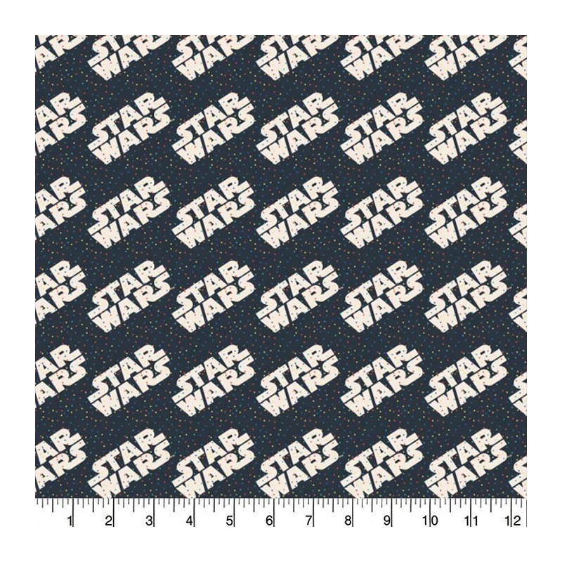 917 321 358**Tecido Star Wars Logo & Bolinhas Azul Marinho - Tecido Star Wars com fundo azul marinho/navy, logo branco e pintinhas coloridas.