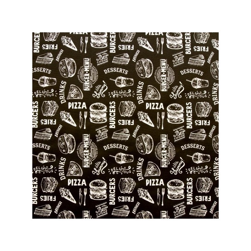 917 321 358**Tecido estampado em loneta de dupla largura, com temática de fast-food de pizzas e hamburgers em tons de preto e branco.