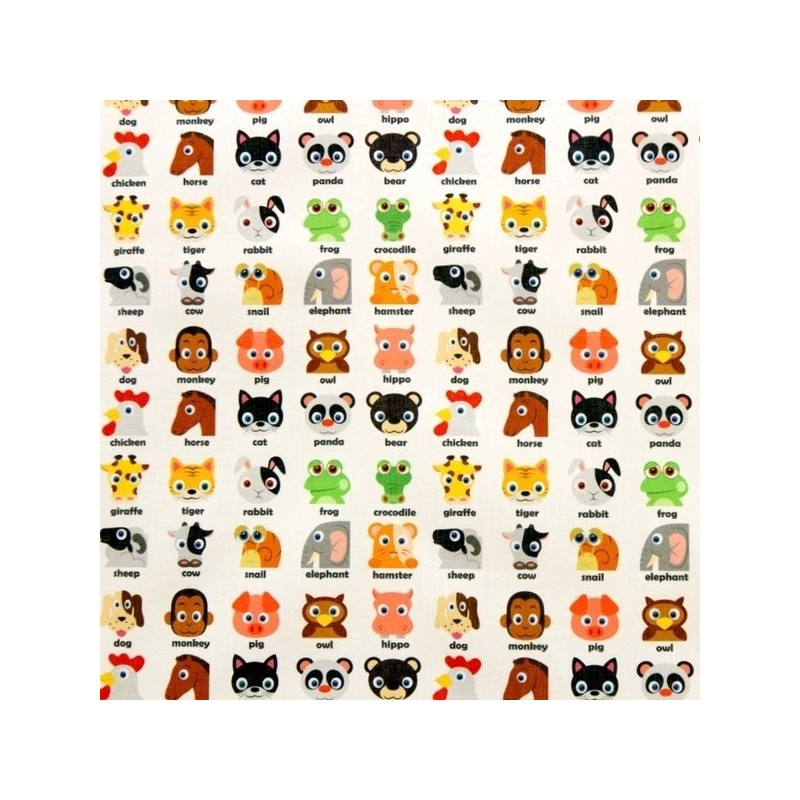 917 321 358**Tecido infantil de estampagem digital em percal de algodão, com ilustrações de animais em tons multicolor.