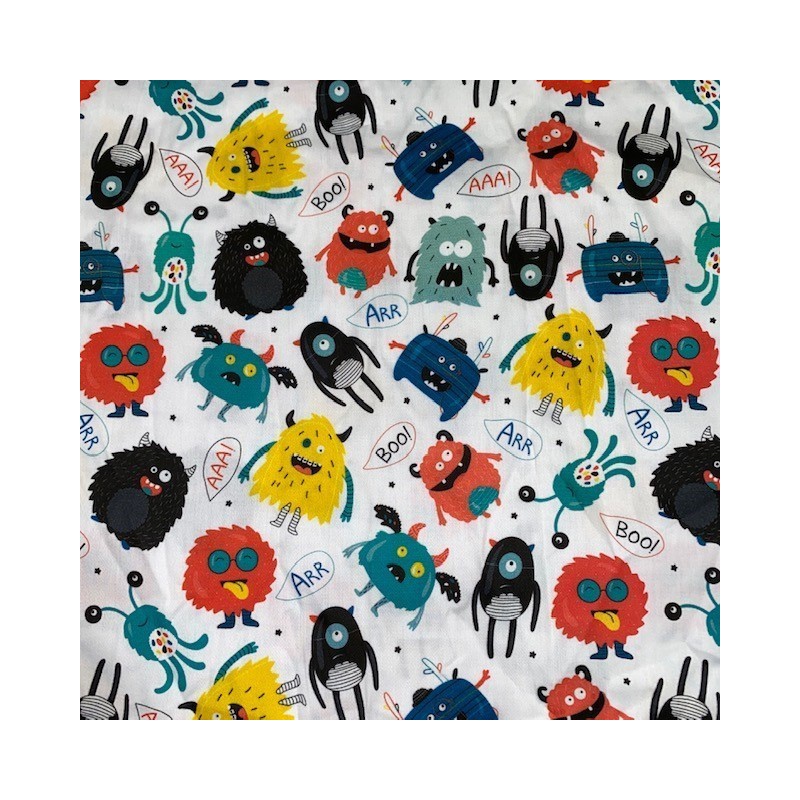 917 321 358**Tecido estampado em percal de algodão com monstrinhos em tons multicolor sobre um fundo branco