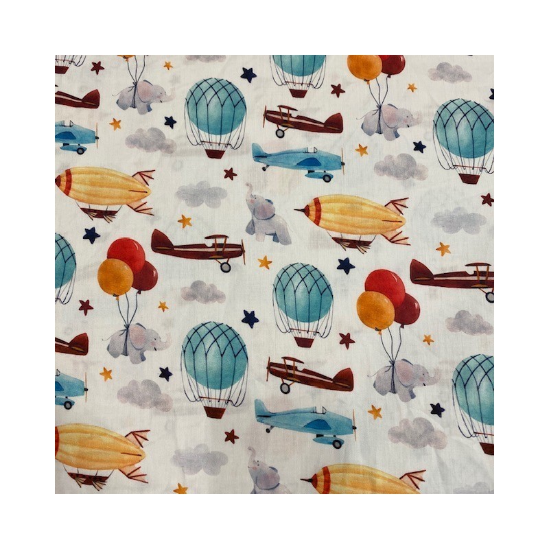 917 321 358**Tecido estampado em percal de algodão com elefantes e balões e aviões.