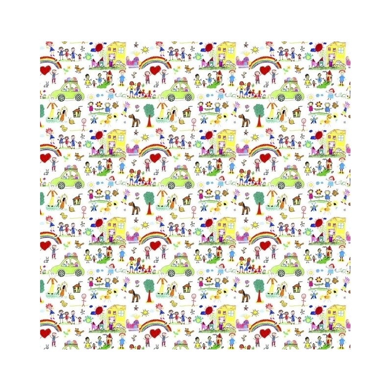 917 321 358**Tecido de estampagem digital em percal de algodão com pequenos desenhos infantis feitos por crianças em tons multicolor.