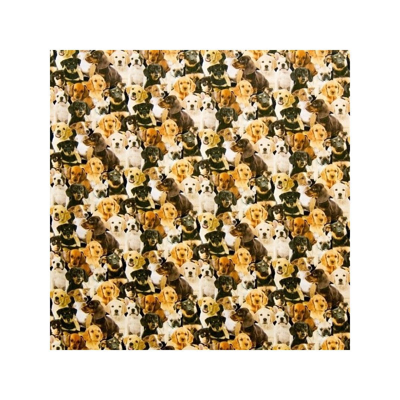 917 321 358**Tecido estampado em percal de algodão com pequenos cãezinhos em tons de castanho, preto, bege e amarelo.