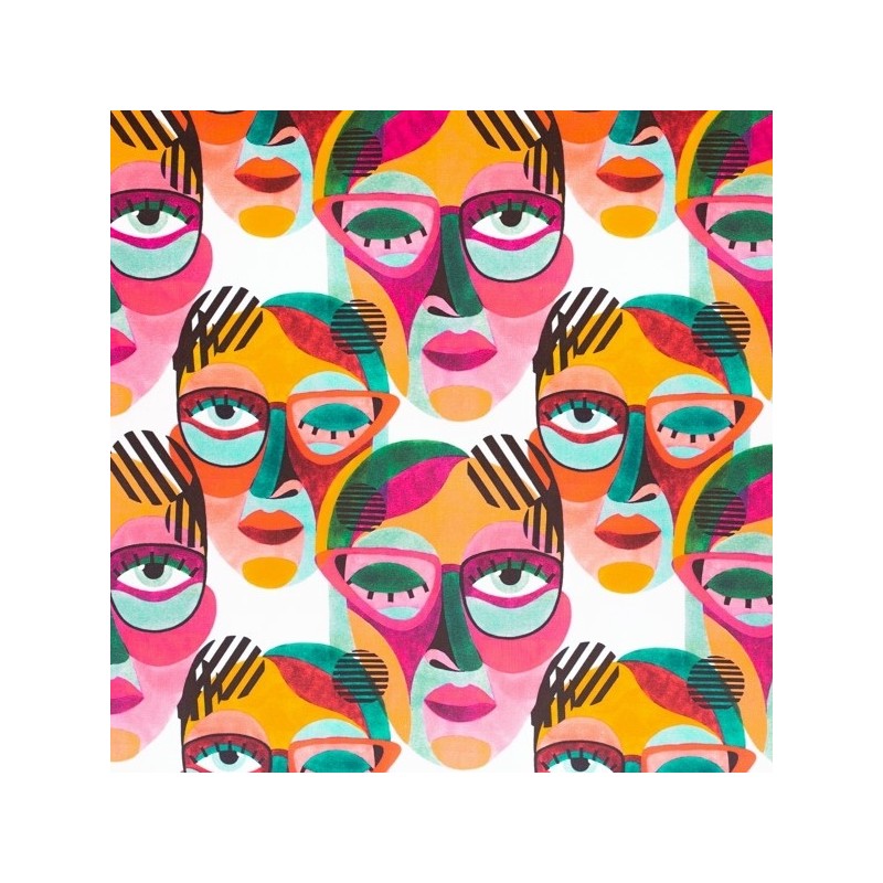 917 321 358**Tecido de estampagem digital em half-panamá de algodão de dupla largura, de inspiração moderna com ilustrações de caras em tons multicolor