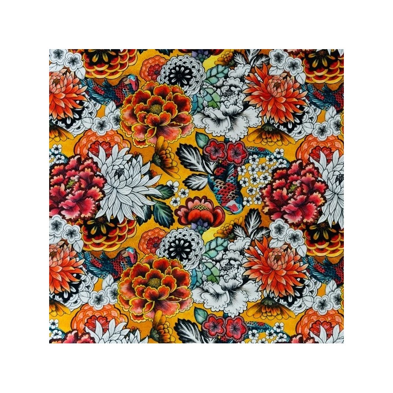 917 321 358**Tecido de estampagem digital em half-panamá de algodão orgânico biológico (cultivado sem utilização de agrotóxicos e pesticidas) de dupla largura, com flores em estilo japonês em tons multicolor sobre um fundo amarelo. Recomendado para quartos, salas, decoração de lojas, confeção de malas e outros adereços.