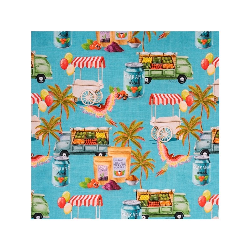 917 321 358**Tecido de estampagem digital em half-panamá de algodão de dupla largura, de inspiração brasileira com carrinhos de venda ambulante, papagaios, guaraná, açaí e palmeiras tropicais em tons multicolor sobre um fundo azul turquesa. Recomendado para quartos e salas, decoração de lojas ou confeção de malas e outros adereços.
