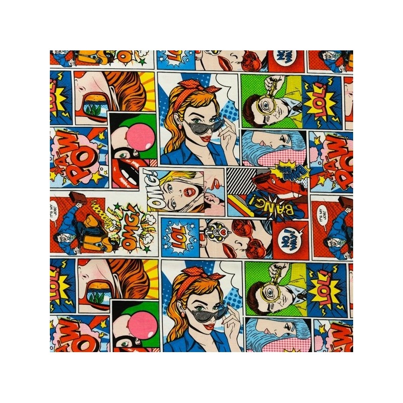 917 321 358**Tecido estampado em loneta de dupla largura, com banda desenhada inspirada na obra de Roy Lichtenstein em tons multicolor. Recomendado para decoração de salas, quartos, escritórios, aplicações em artesanato, souvenires, pequenas peças e outros adereços.