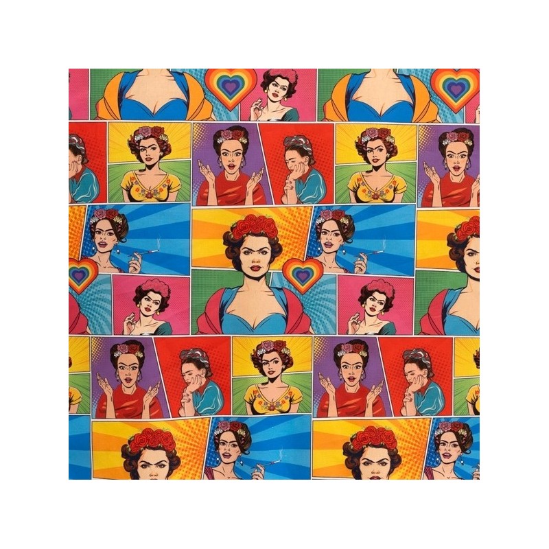917 321 358**Tecido de estampagem digital em half-panamá de algodão orgânico biológico (cultivado sem utilização de agrotóxicos e pesticidas) de dupla largura, com ilustrações de Frida Kahlo inspirado no estilo Pop Art de Andy Warhol em tons multicolor. Recomendado para quartos, salas, escritórios, decoração de lojas, confeção de malas e outros adereços.