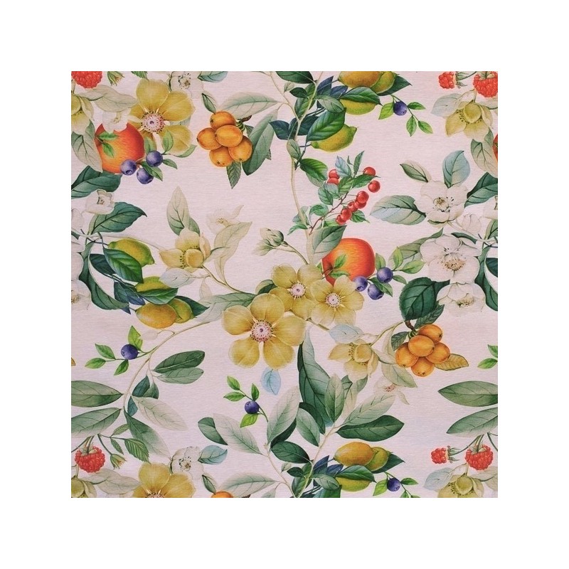 917 321 358**Tecido de estampagem digital em loneta de dupla largura, com frutas e flores em tons multicolor. Recomendado para quartos, salas, escritórios, decoração de lojas, confecção de malas e outros adereços.