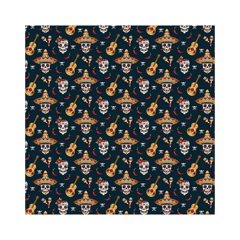 Tecido de estampagem digital em percal de algodão com pequenas caveiras do Dia de los Muertos em tons multicolor.