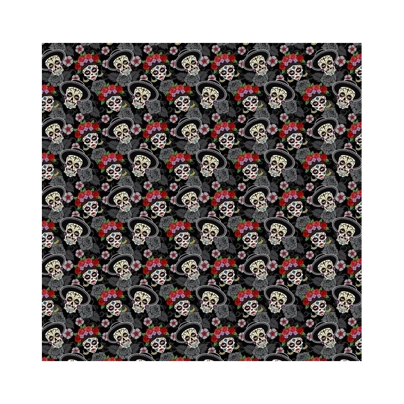 Tecido de estampagem digital em percal de algodão com pequenas caveiras do Dia de los Muertos em tons multicolor.