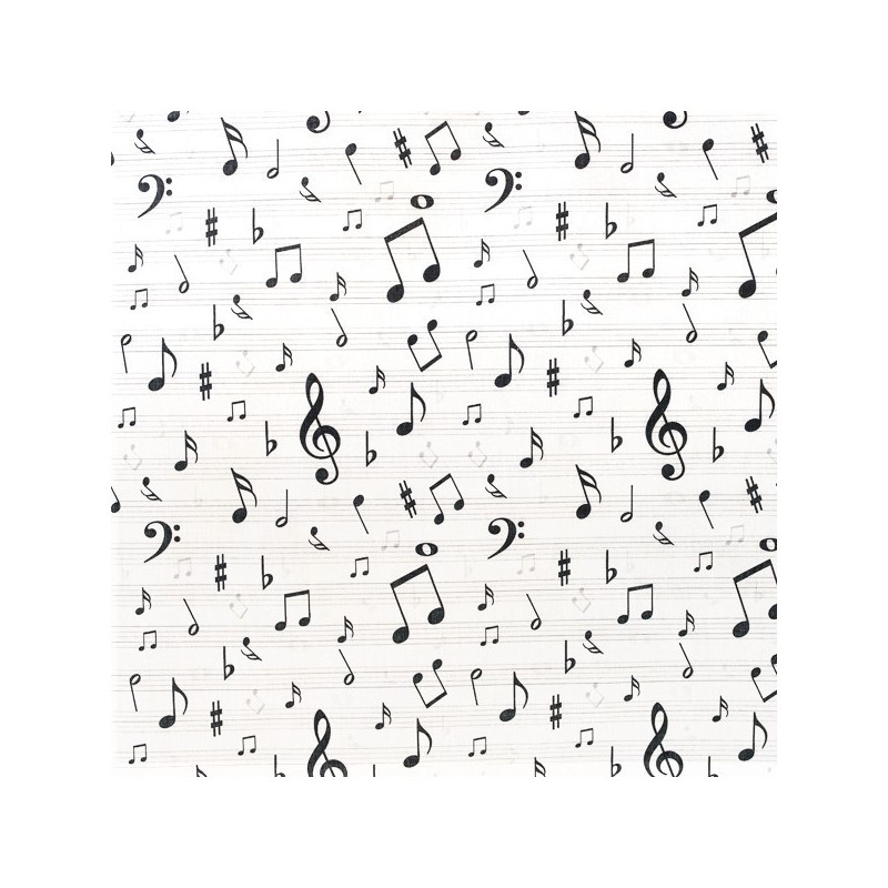 917 321 358**Tecido de estampagem digital em percal de algodão com partituras e notas musicais em tons de preto sobre um fundo branco.