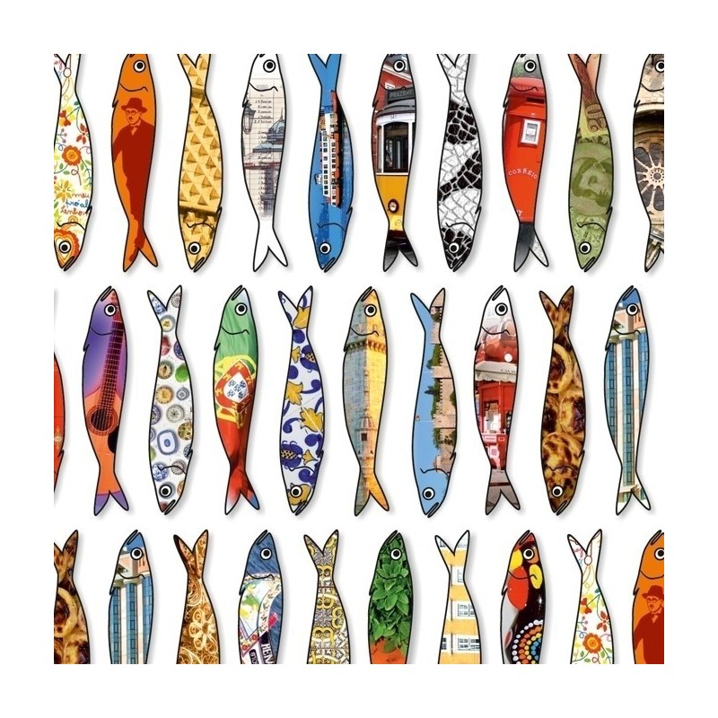 917 321 358**Tecido estampado em half-panamá de algodão de dupla largura (280cm) com a representação de sardinhas com imagens de Lisboa.