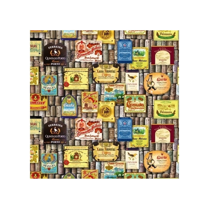 917 321 358**Tecido com ilustrações de rótulos de vinhos portugueses sobre um fundo de rolhas de cortiça em tons multicolor.